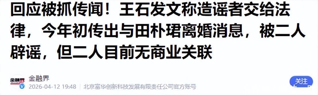 部分参考资料:王石已次被传失联被抓 不断被卷入各种舆论——钱江视频王石田朴珺夫妇回应“被抓”传闻:一切安好,造谣者交给法律——红星新闻回应被抓传闻!王石发文称造谣者交给法律,今年初传出与田朴珺离婚消息,被二人辟谣,但二人目前无商业关联——金融界